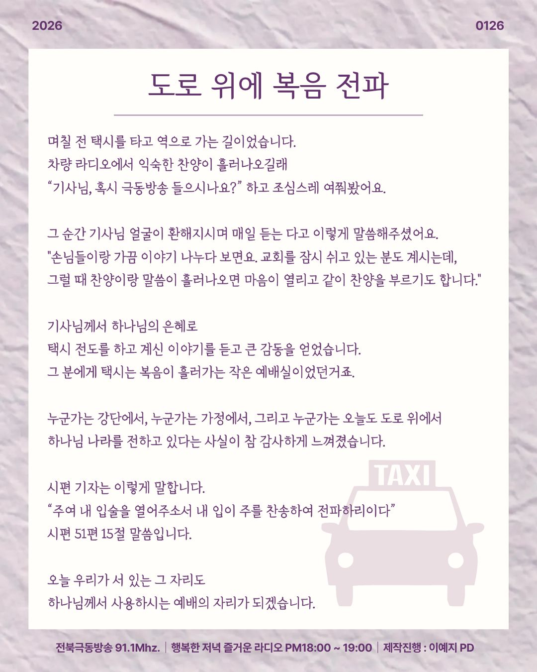 2026년 1월 26일 오프닝 [ 도로 위에 복음 전파 ]